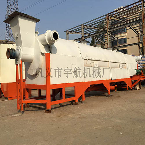 鞏義宇航機械生產(chǎn)的炭化機,詳細來說是連續(xù)式炭化機,對稻谷,秸稈,椰殼,鋸末、麩皮、小麥、木屑、果殼、花生皮、樹皮等進行碳化,開發(fā)了比煤更有價值的能源產(chǎn)品,有利于環(huán)保,有利于農(nóng)業(yè)產(chǎn)品的附加值提升。 碳化機概述:碳化機主機由內(nèi)、外兩層筒體嵌套而成,工作時,物料先進入內(nèi)筒體進行干燥預熱處理,然后進入外筒碳化處理,外筒體由木煤氣燃燒室包裹加熱。由于外部筒體由高溫火焰直接加熱所以我們從使用壽命上考慮選用的是 316L 材質(zhì)的外筒體。外筒體高熱區(qū)長期正常工作溫度將達到 700 度左右,局部高溫將達到 800 度左右;預熱干燥后的物料從進入高溫區(qū)后緩緩通過高溫區(qū)發(fā)生裂解碳化反應。碳化機主機選用變頻調(diào)速電機,可隨時根據(jù)物料粒度水分變化等因素調(diào)節(jié)筒體轉(zhuǎn)速,控制產(chǎn)品碳化溫度和碳化時間。 炭化過程中所產(chǎn)生的煙氣再通過噴淋、冷卻、凈化等過程,使產(chǎn)生的可燃氣體進行二次燃燒。按如此方式循環(huán),利用自體產(chǎn)生的熱量燃燒自體,達到節(jié)能的效果。而且此過程煙氣在管道內(nèi)經(jīng)過凈化后,生產(chǎn)環(huán)境中無煙氣,具環(huán)保性,達到國家廢氣排空標準。