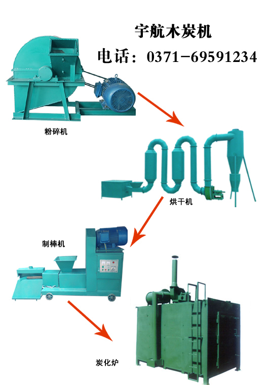 新型機(jī)制木炭機(jī)設(shè)備將樹枝、秸稈、稻草、花生殼、樹干、 棉花秸稈、 茶籽殼、果殼、 雜草、樹葉等含有可以生產(chǎn) 木炭的生物質(zhì)纖維的原料填入,經(jīng)粉碎機(jī)粉碎成10mm之內(nèi)的粉末,經(jīng)烘干機(jī)烘干使之含水份含量在12%以內(nèi),入制棒機(jī) 經(jīng)高溫,高壓使之成型(不加任何添加劑)后放入炭化爐進(jìn)行炭化,即成成品機(jī)制木炭。也可以將物料粉末直接使用連 續(xù)式